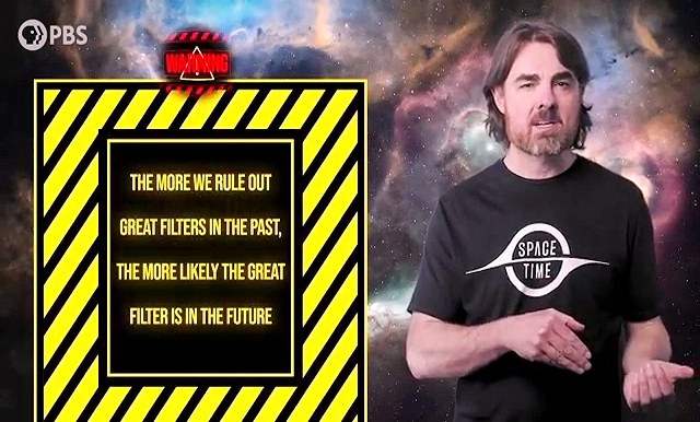 This is where Perseverance's discovery of the signs of possible past Martian microbial life comes in. If life did arise independently on both Mars and Earth then one major, early Fermi filter can be ruled out. It would appear that the rise of life itself is apparently an easy evolutionary step. If this is the case, Matt O'Dowd muses, and if things like the rise of eukaryotes ('good' cells) from prokaryotes (simple, 'before nucleus' cells), multicellularity, are easy evolutionary steps, then this means that the great filter is not an early filter but a late one. The more we rule out great filters in the past; the more likely that a great filter is in the future! It means that we have yet to encounter it. Such a late filter could be global Armageddon through nuclear war, or it could be that interstellar colonisation is so difficult as being next to impossible. Or it could be that super-artificial intelligence destroys us: Skynet is an obvious SFnal example. (I have often warned that the machines are taking over, but no-one ever seems to listen.) If all this is the case, the Perseverance's discovery – should it really be a sign of former early Martian life – could be evidence that we have yet to encounter the great filter: it could be evidence of our doom to come! The filter has to be somewhere: we don't see aliens. ![]() Matt O'Dowd ponders if the great filter is in the future.